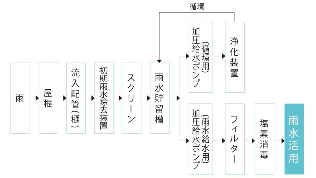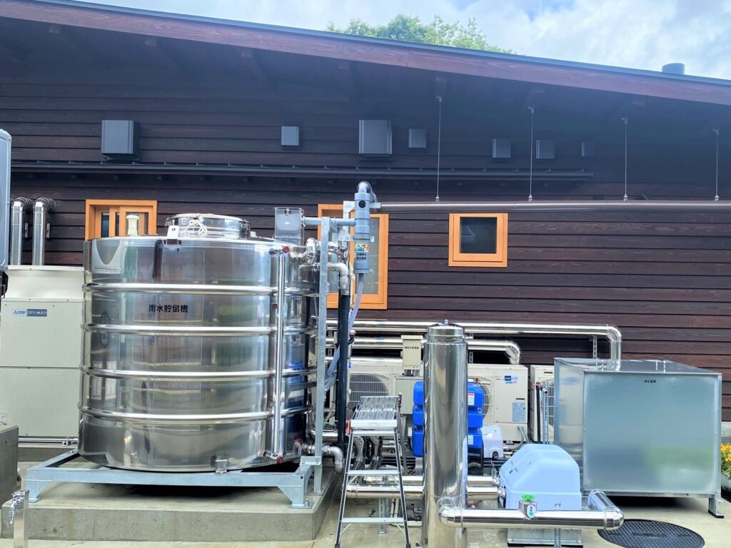 貯めた雨水を浄化装置に通し循環させ、塩素消毒をした後に雨水活用しています。