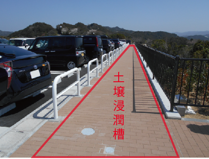 駐車場の脇に土壌浸潤槽を縦長に設置し、埋戻して通路にすることで“デッドスペース”を活用した平面配置の事例となっています。